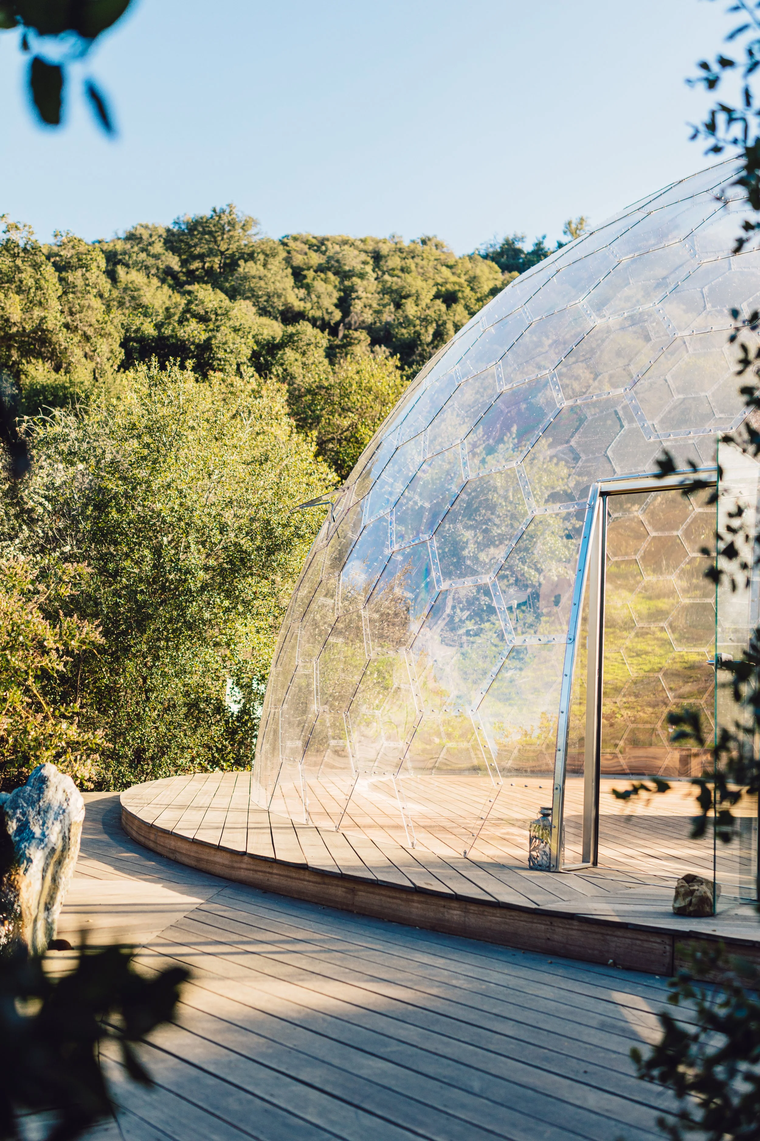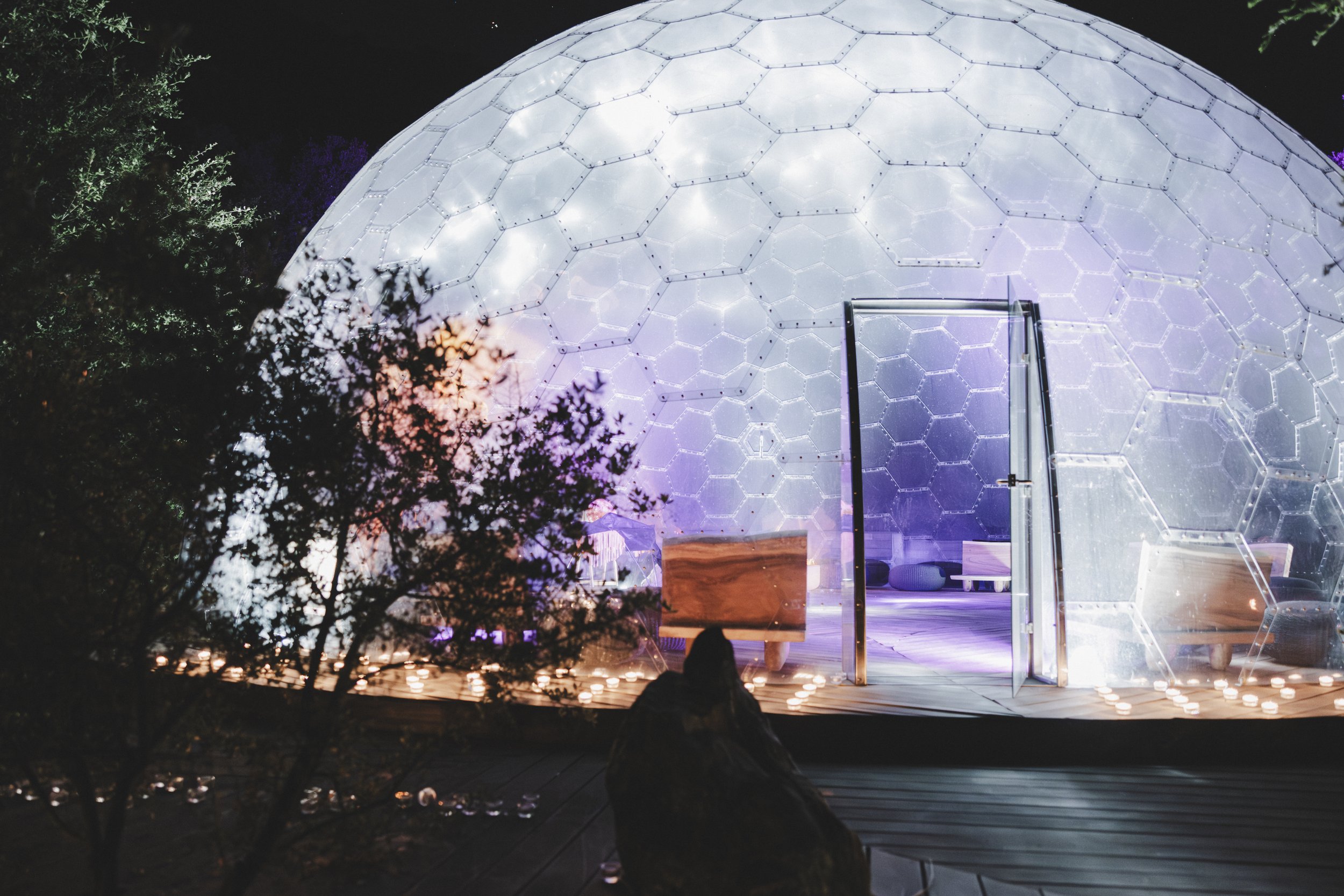 wooden platform extends beyond the dome, creating a lounge area inside and outside