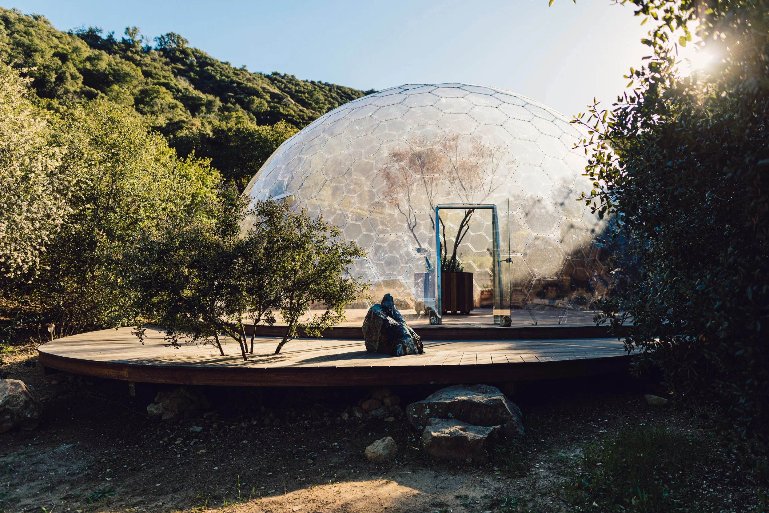 Enter the 40' Luna Dome, a stunning pavilion-style frameless building, fully transparent and offering 360-degree views of the surrounding environment. With its clear exterior natural light and the beauty of nature are fully present within the space. A custom-built wooden deck lines the floor, where you can relax and enjoy the breathtaking views. Natural stone boulders peek through, providing a unique and picturesque touch to the front porch and lounge area outside of the dome.