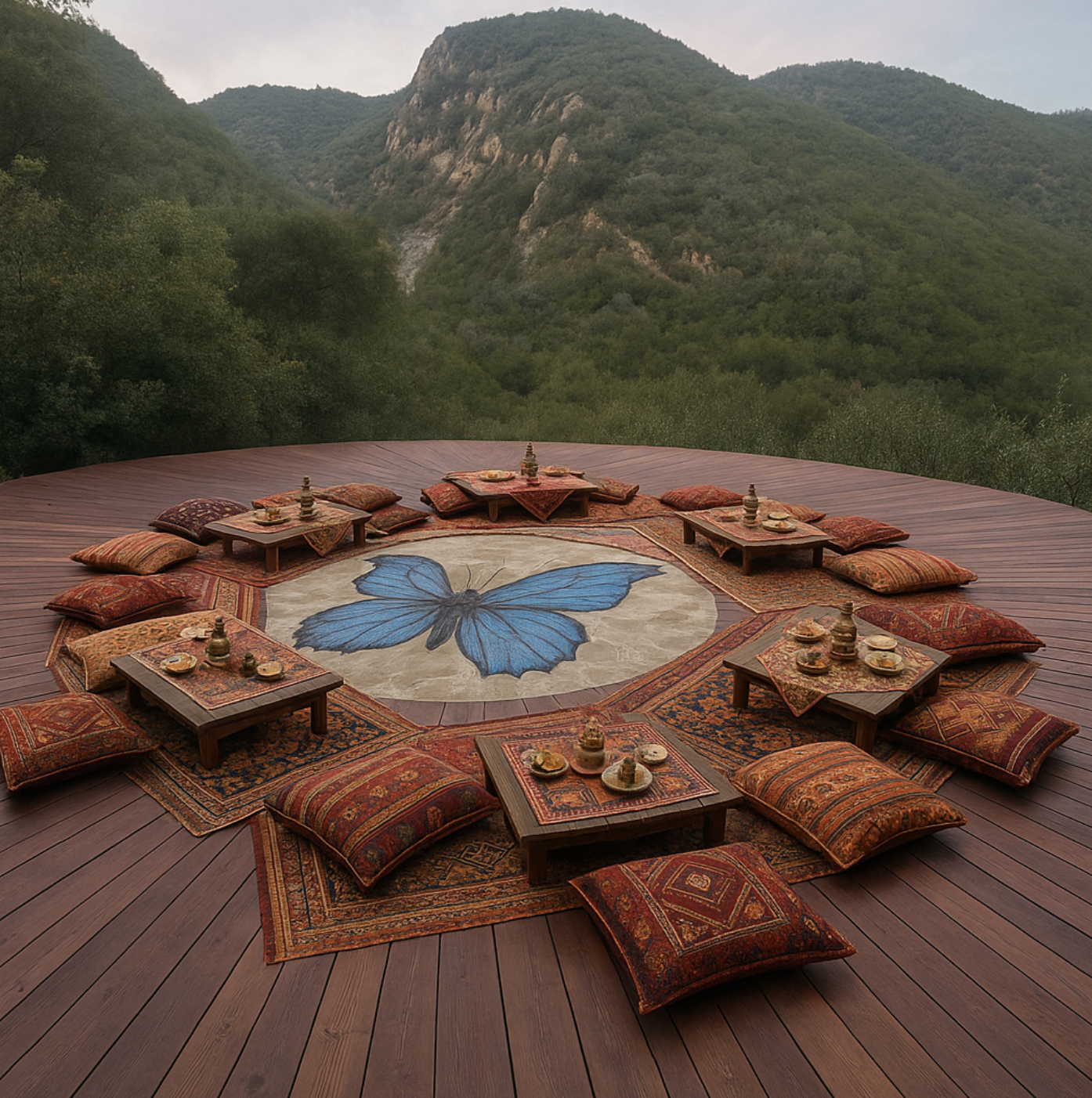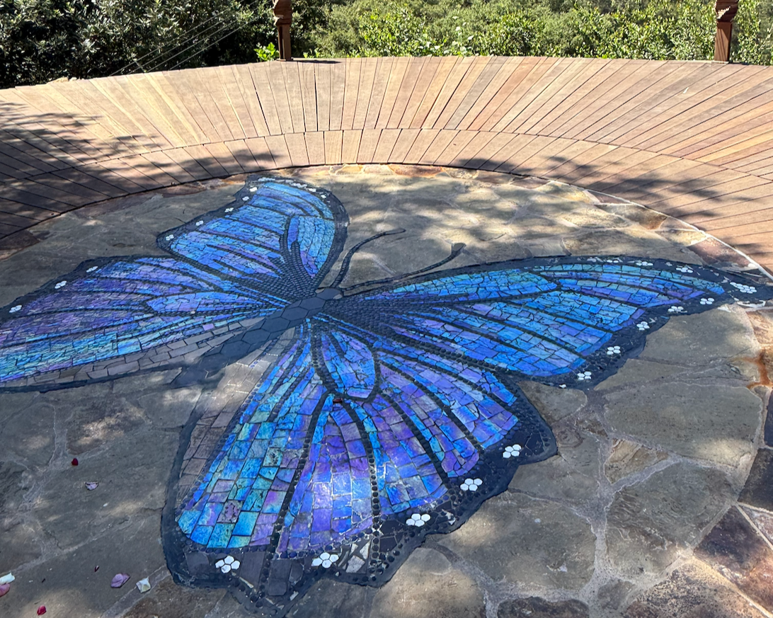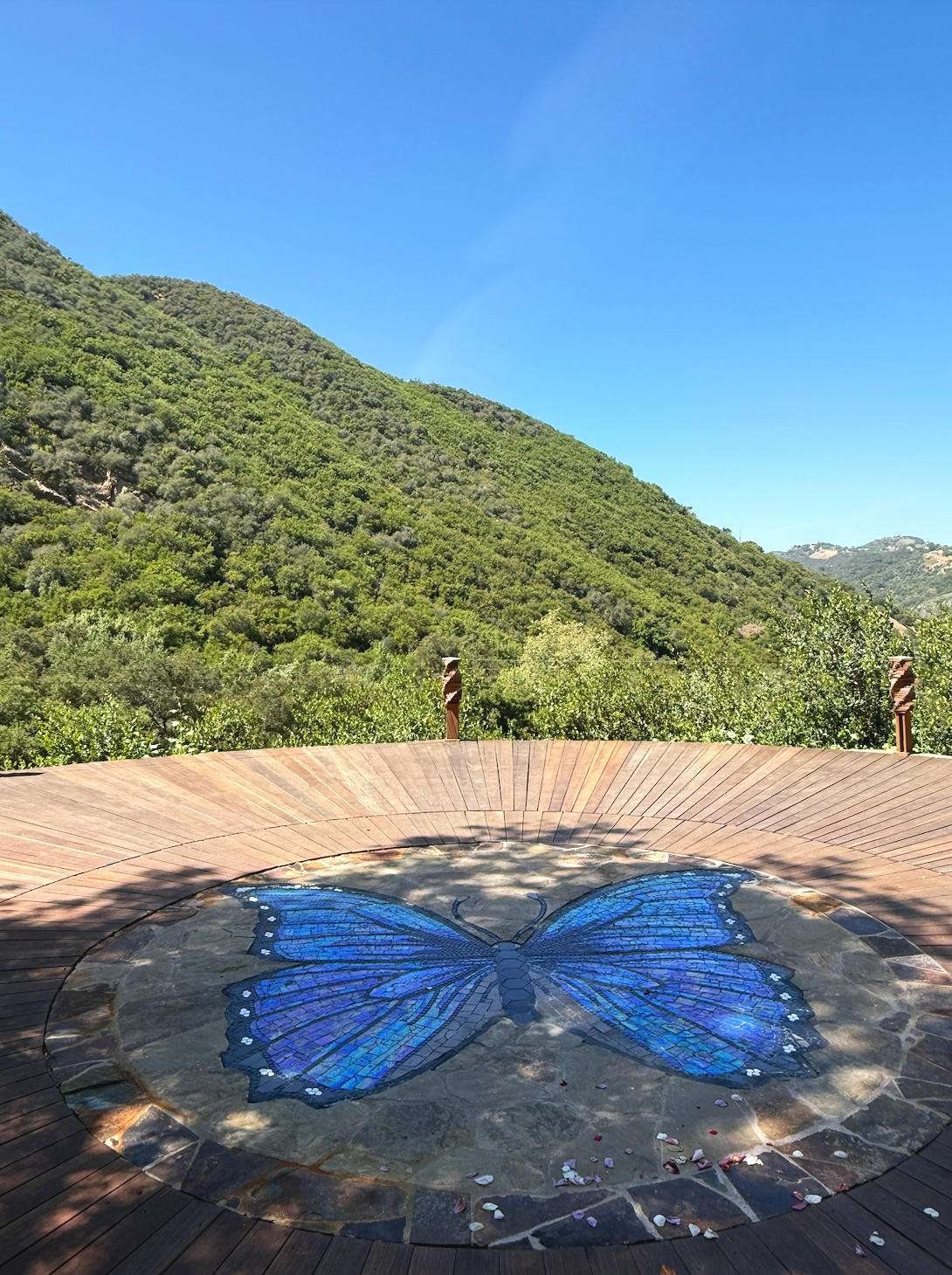 a stunning 40-foot circular deck designed as a gathering space immersed in nature. Set against rolling hills and overlooking a seasonal waterfall, it offers a peaceful and expansive backdrop for meaningful moments. Surrounded by natural beauty and grounded by its unique butterfly centerpiece, Monarch Landing invites connection, creativity, and presence in a truly memorable setting.